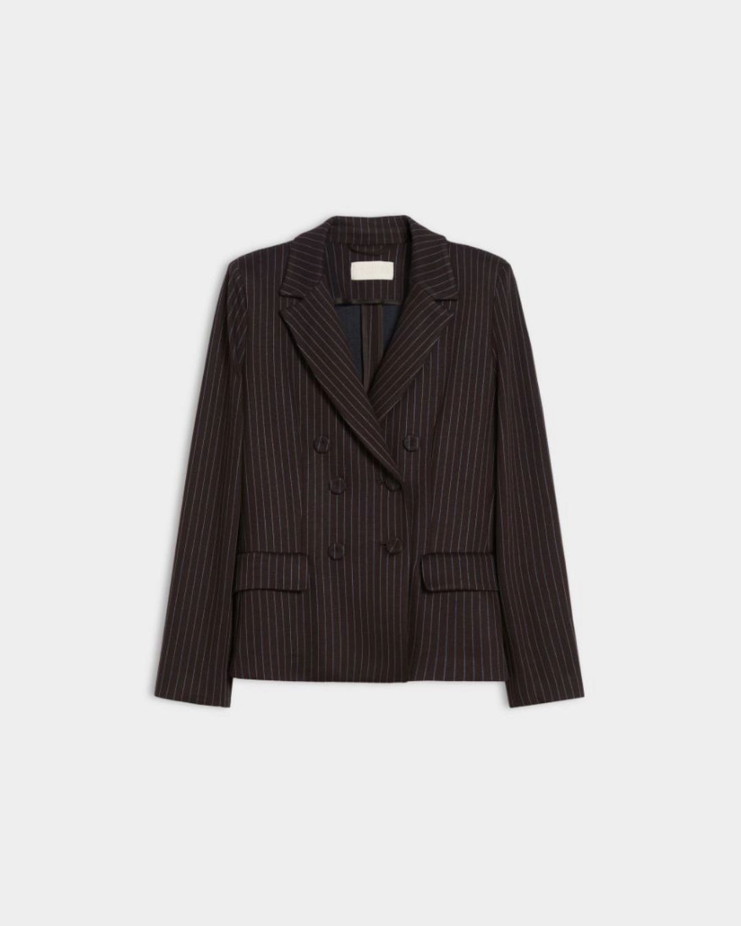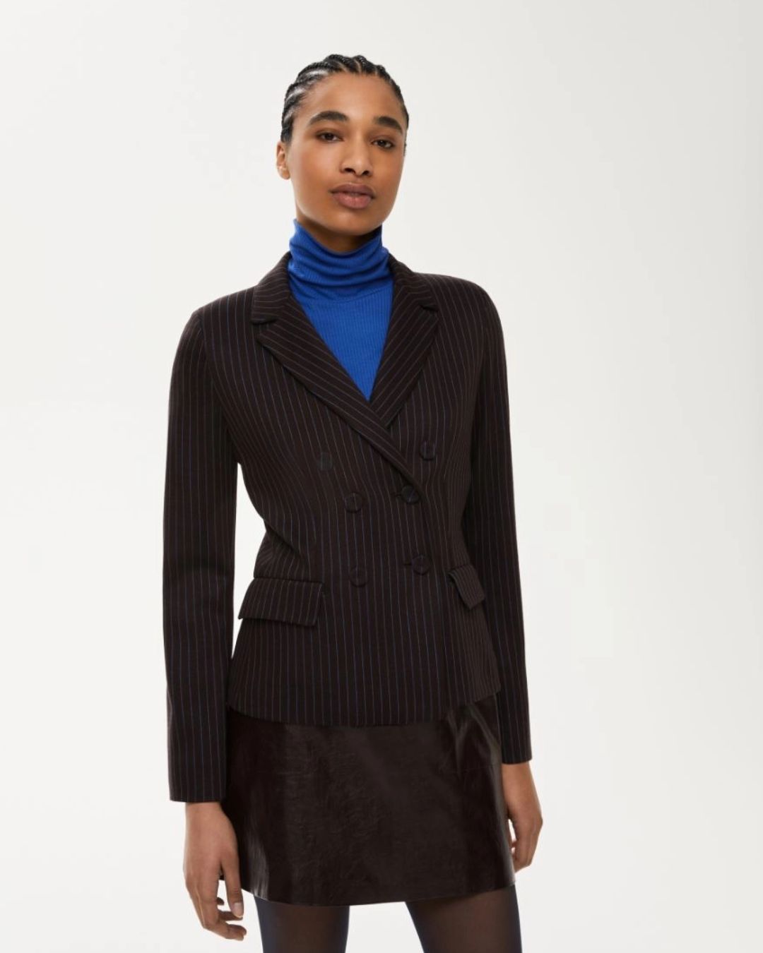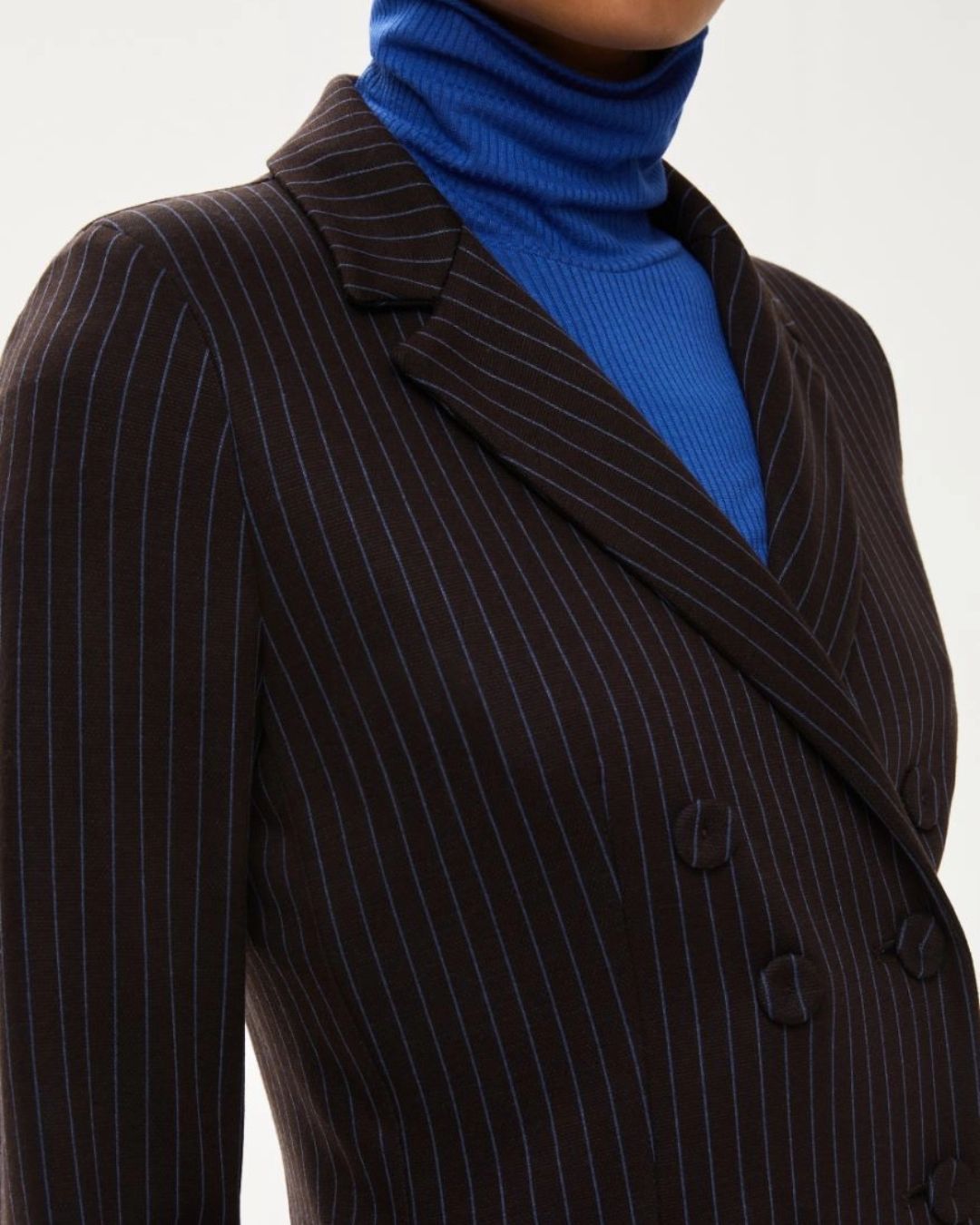 Confeccionada en tejido jacquard elástico, aporta estructura y comodidad a partes iguales. Su diseño cruzado con botones forrados, solapa clásica y bolsillos con solapa evocan la sastrería más refinada, mientras que el corte ajustado realza la figura con un aire actual y femenino.