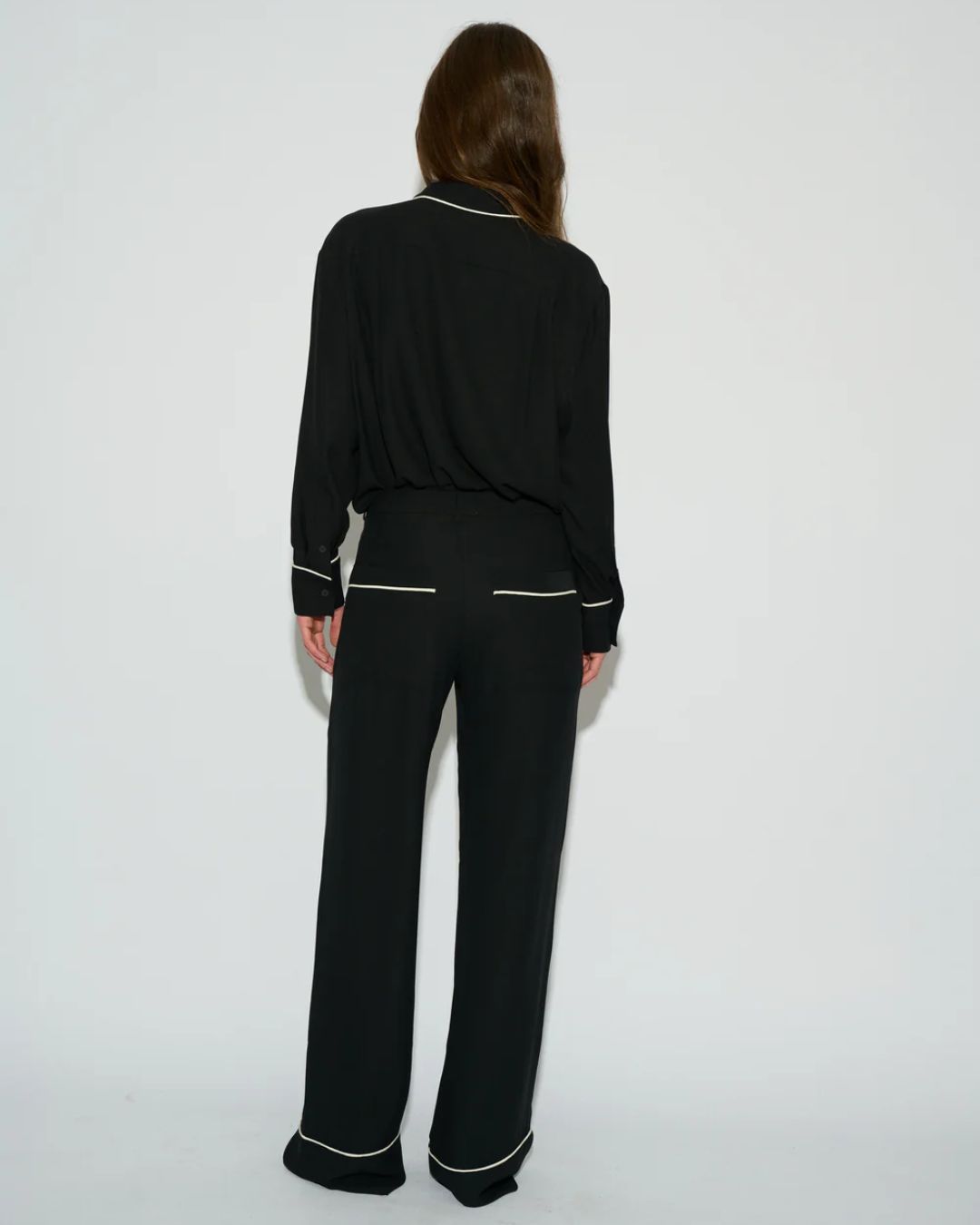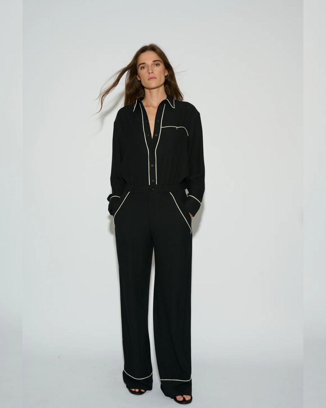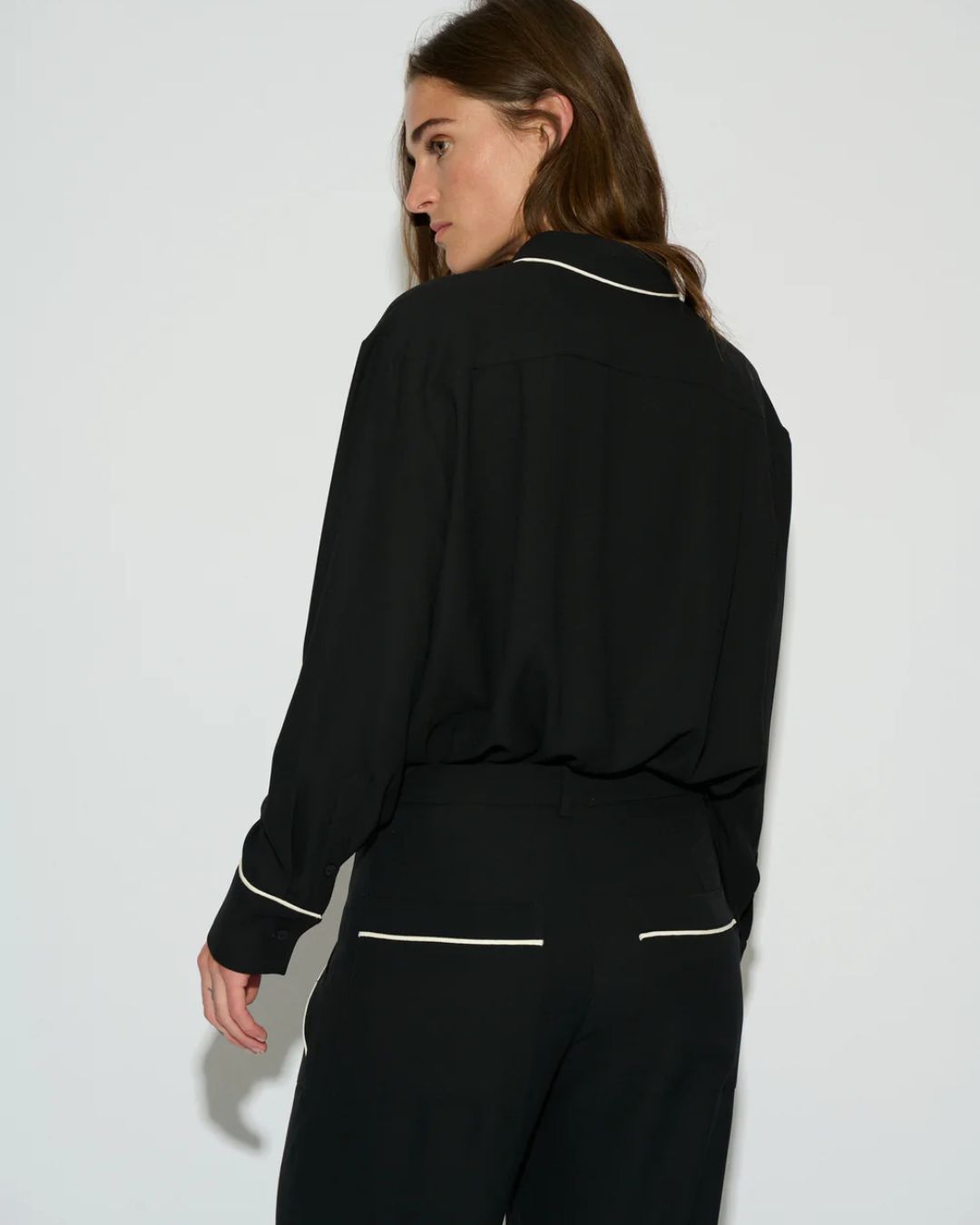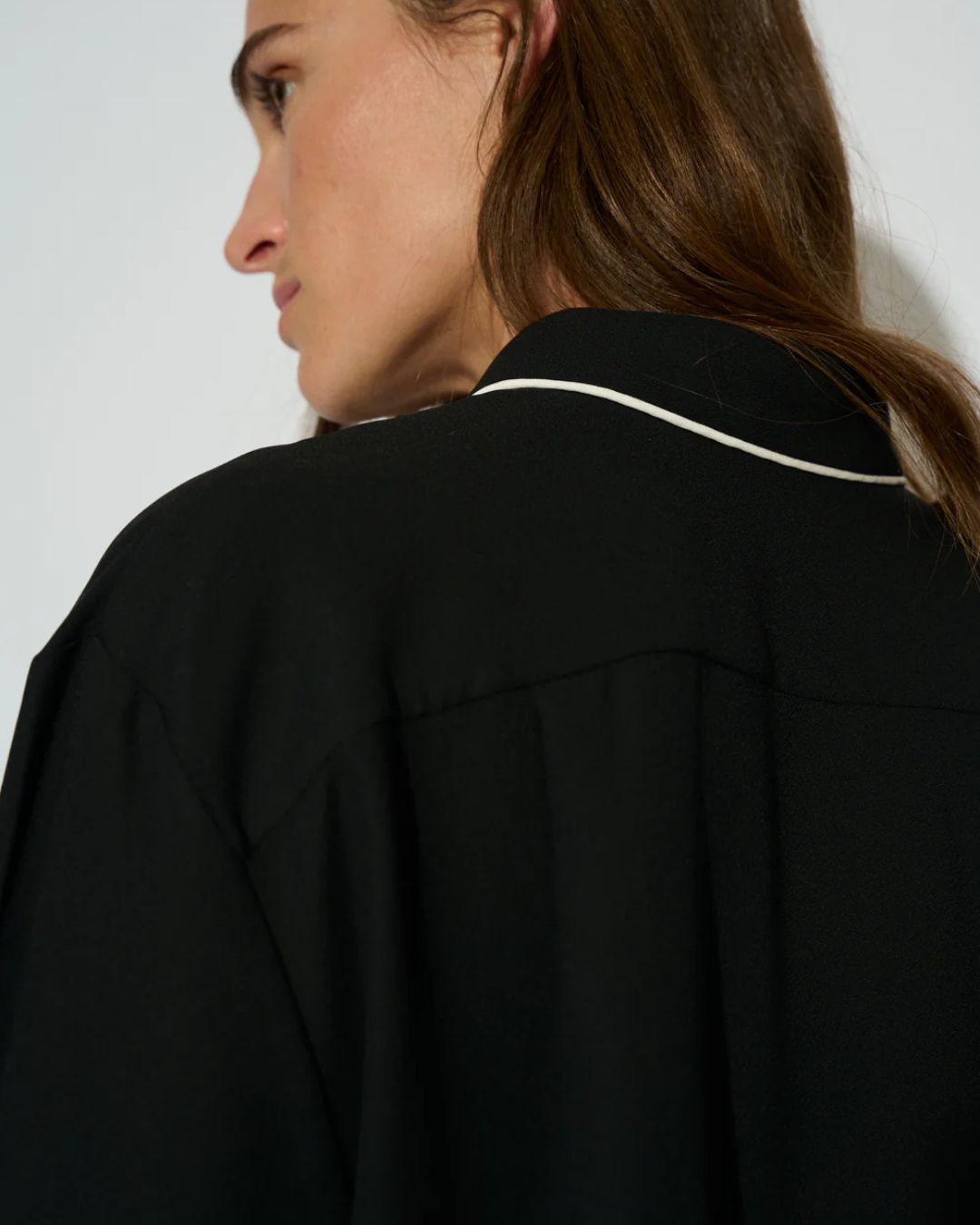Diseñada con cuello de solapa, mangas largas con puños abotonados y cierre frontal con botones, destaca por los ribetes en contraste que aportan un toque distintivo y elegante. Está confeccionada en crepé fluido, un tejido ligero y resistente a las arrugas que garantiza comodidad y una caída impecable durante todo el día.