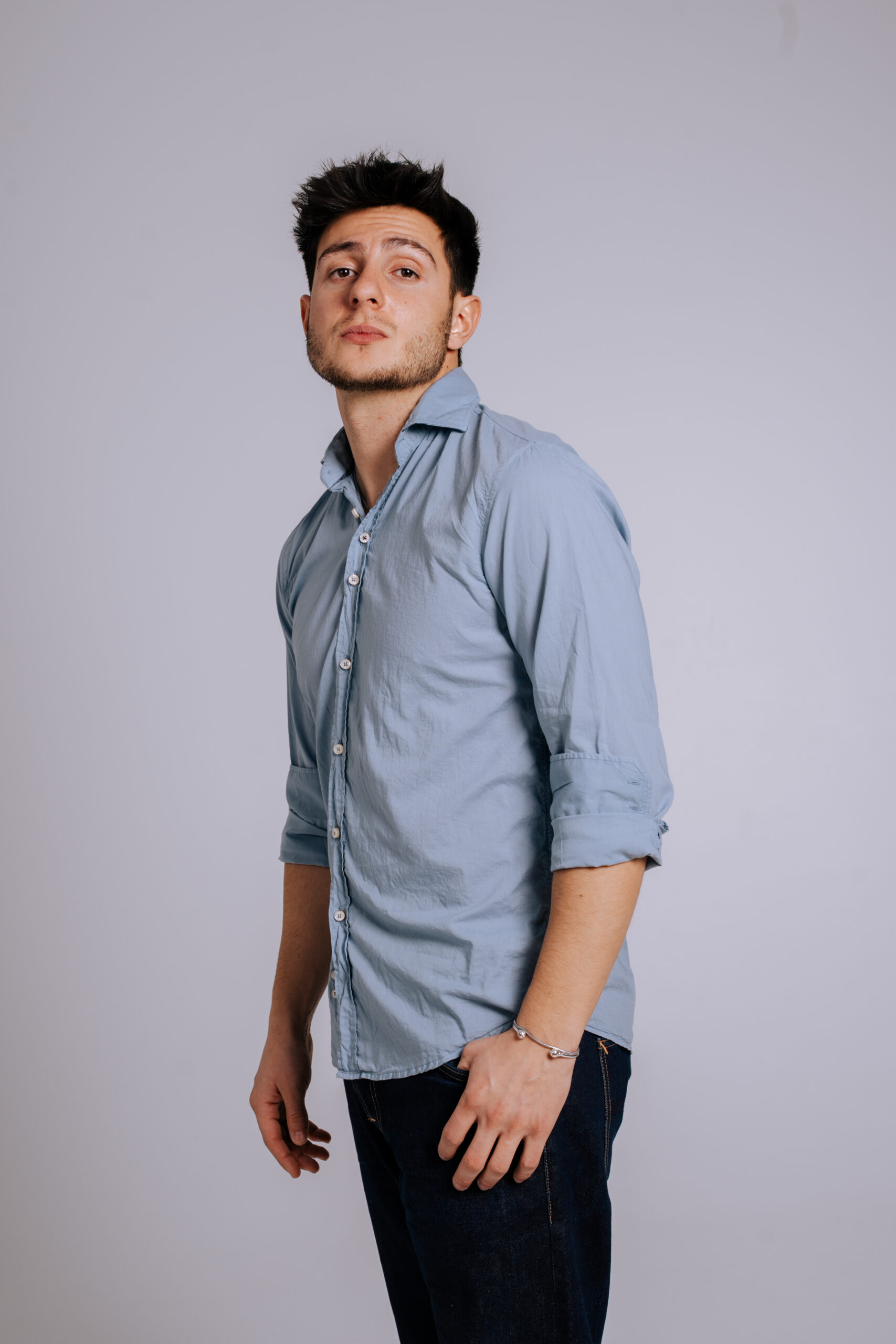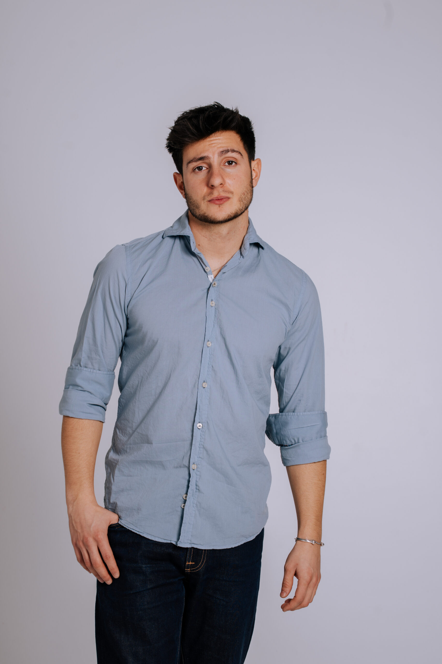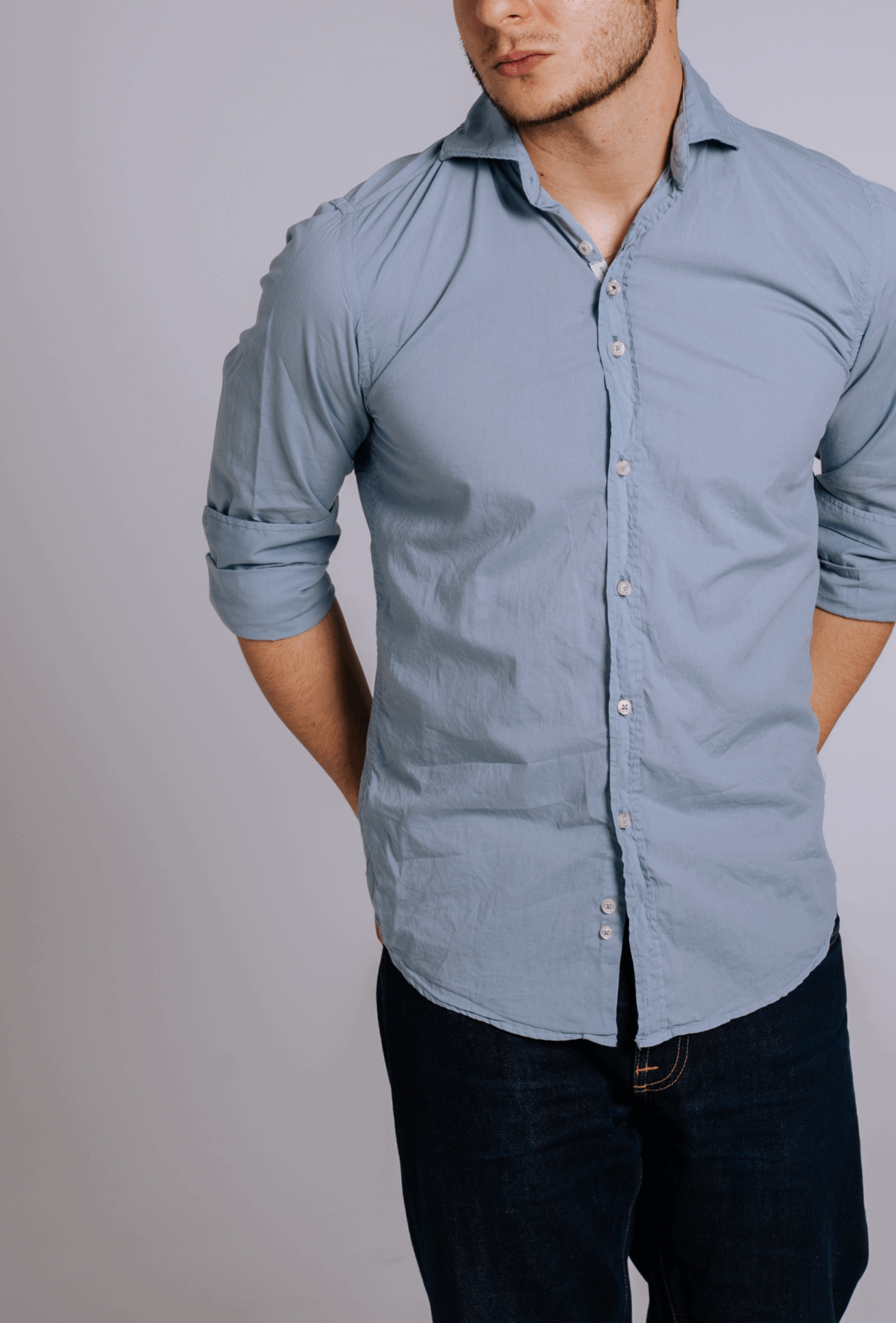 Una camisa confeccionada en 100% algodón extrafino de alta calidad, con un diseño sofisticado que destaca por su proceso artesanal de tintado, logrando una tonalidad azul piedra única y una textura excepcional.