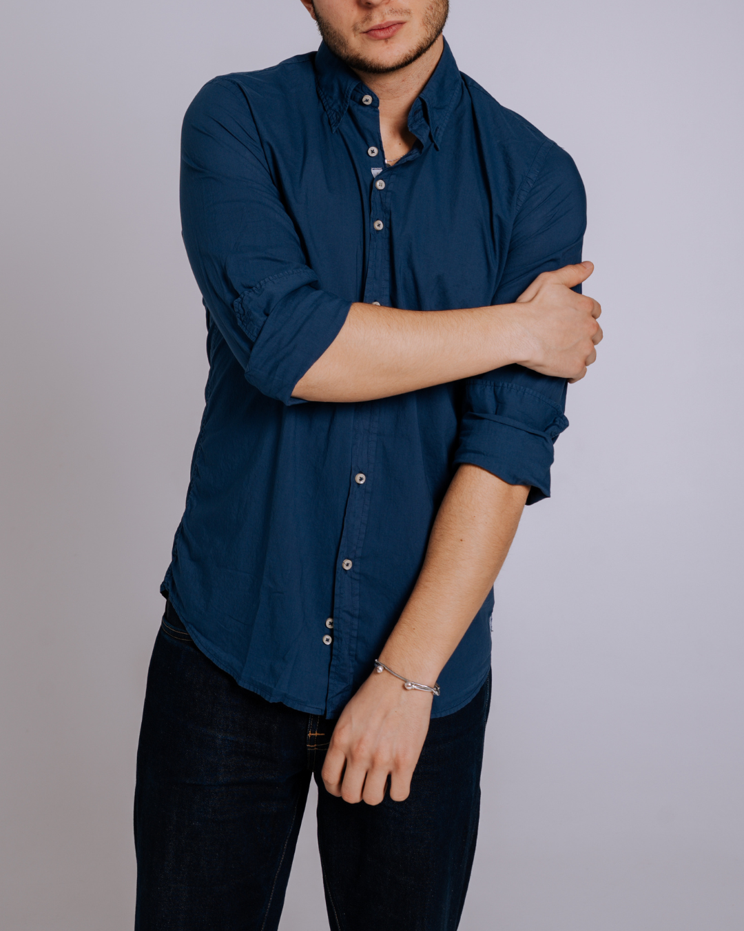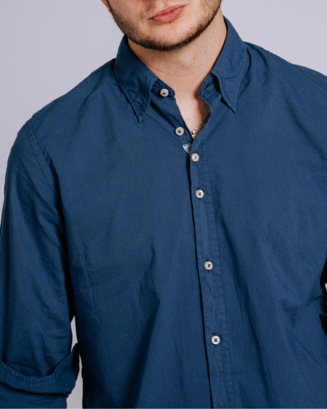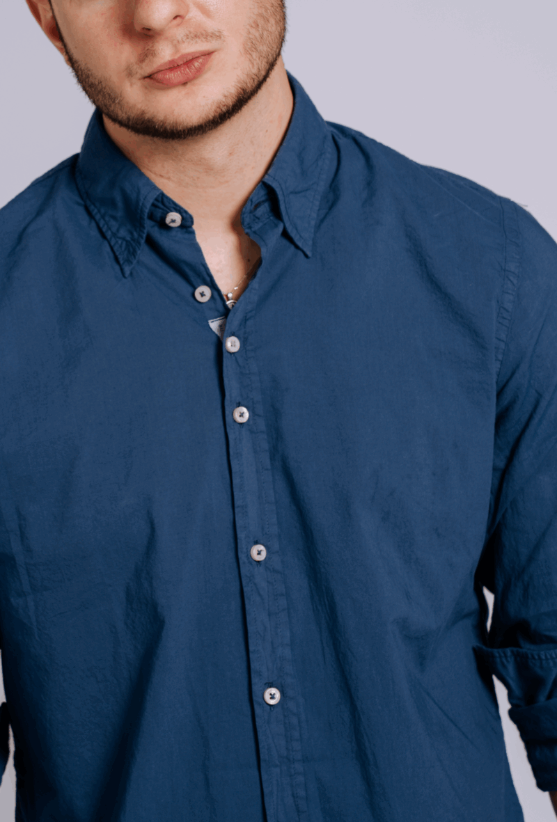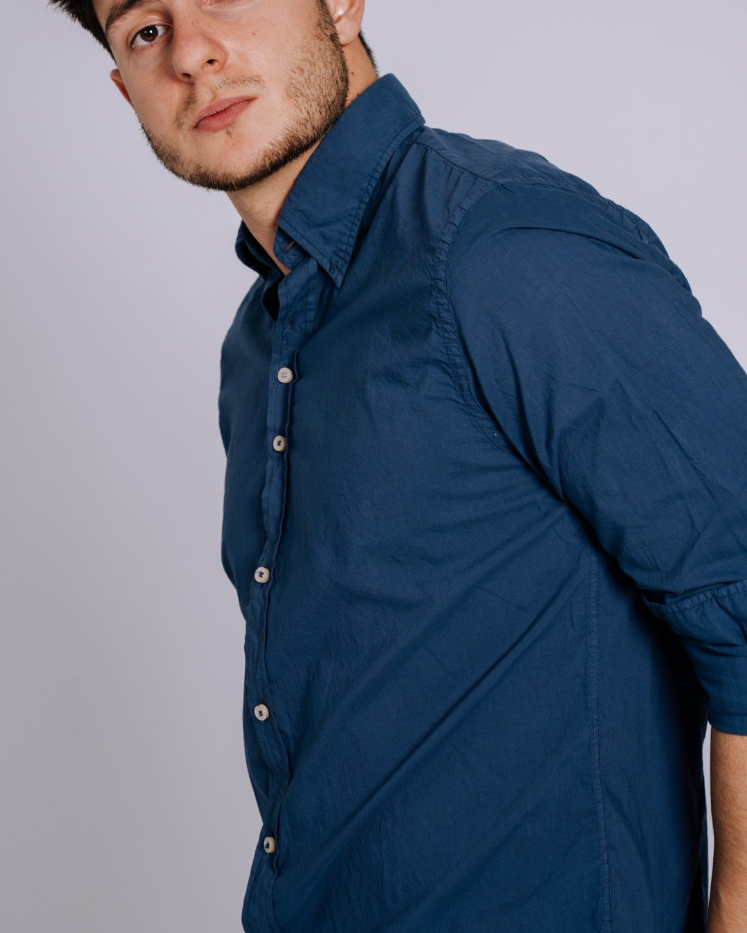 Una camisa confeccionada en 100% algodón extrafino de alta calidad, con un diseño sofisticado que destaca por su proceso artesanal de tintado, logrando una tonalidad navy profunda y una textura excepcional.