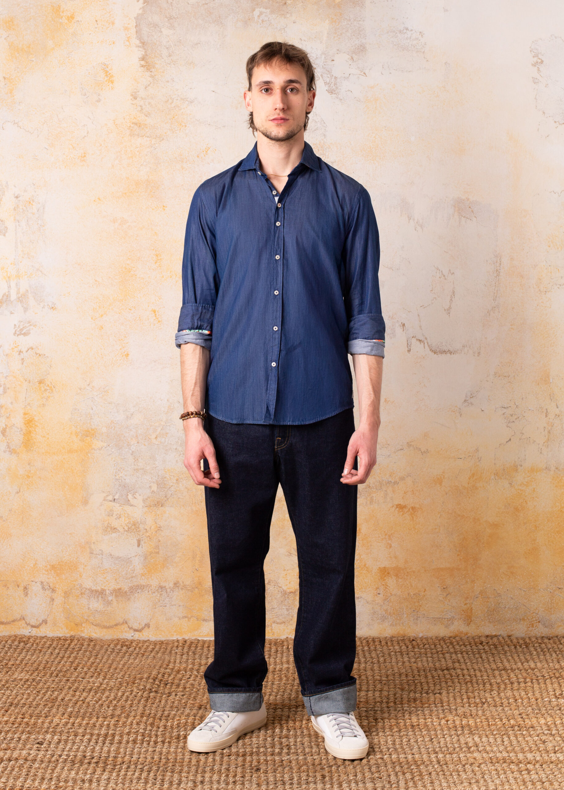 Una camisa con personalidad, confeccionada en 100% algodón Somelos de alta calidad, con un diseño sofisticado que destaca por su tonalidad azul cielo y detalles únicos.