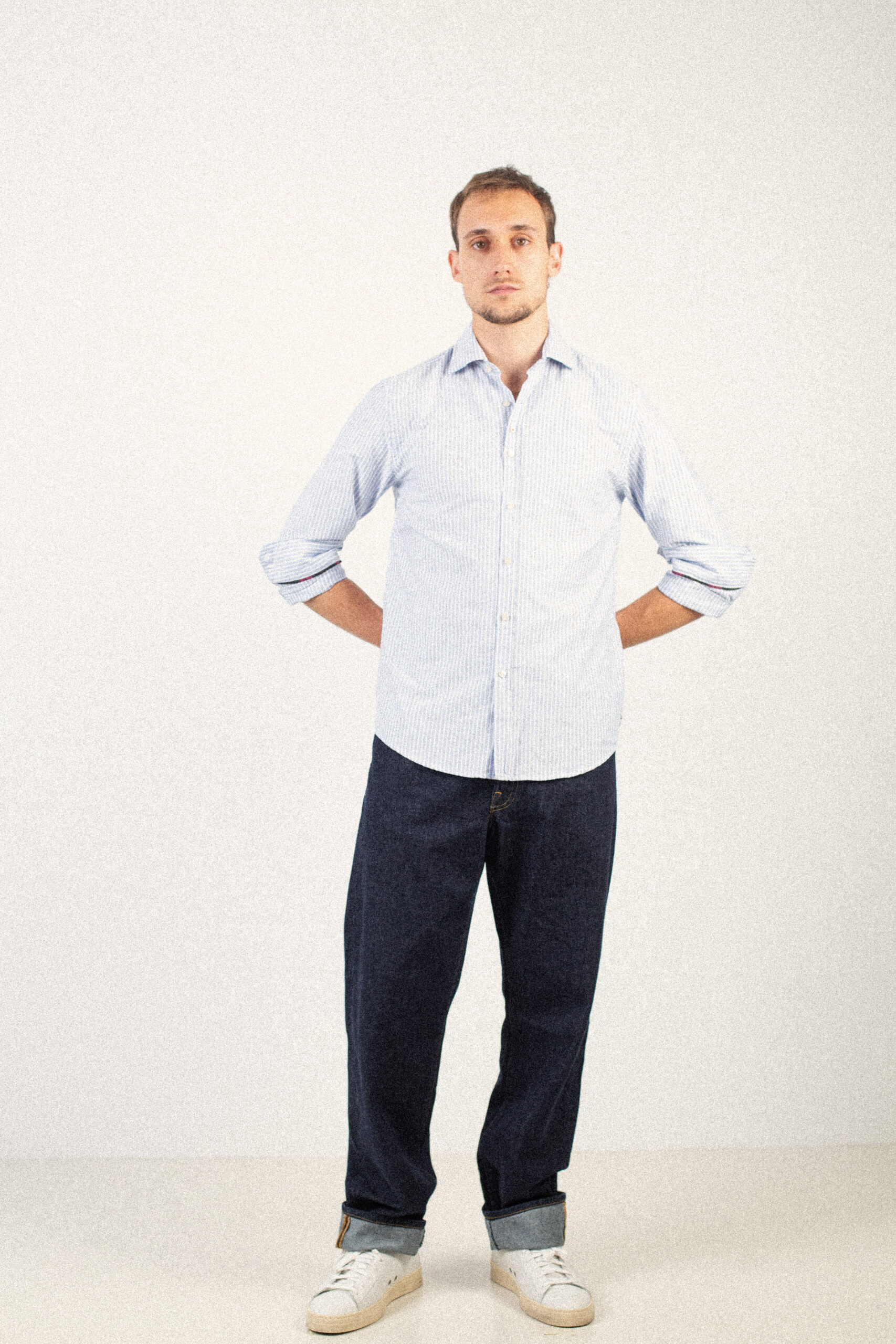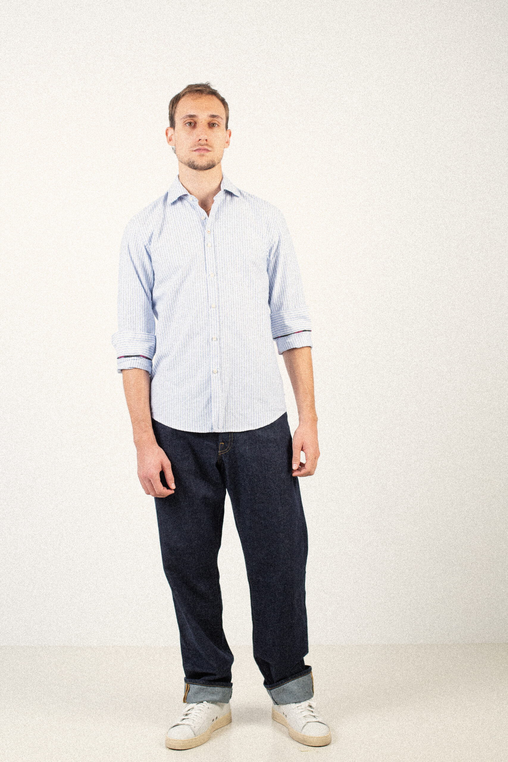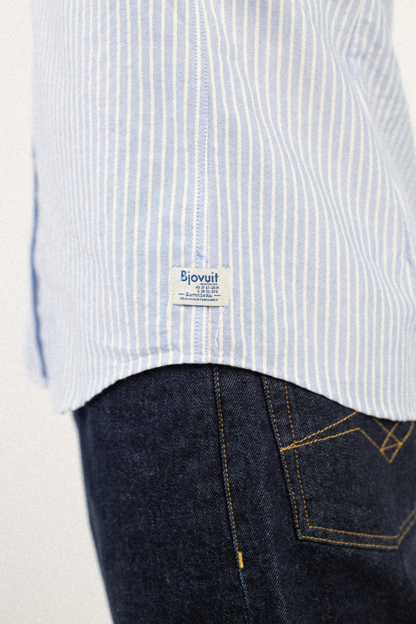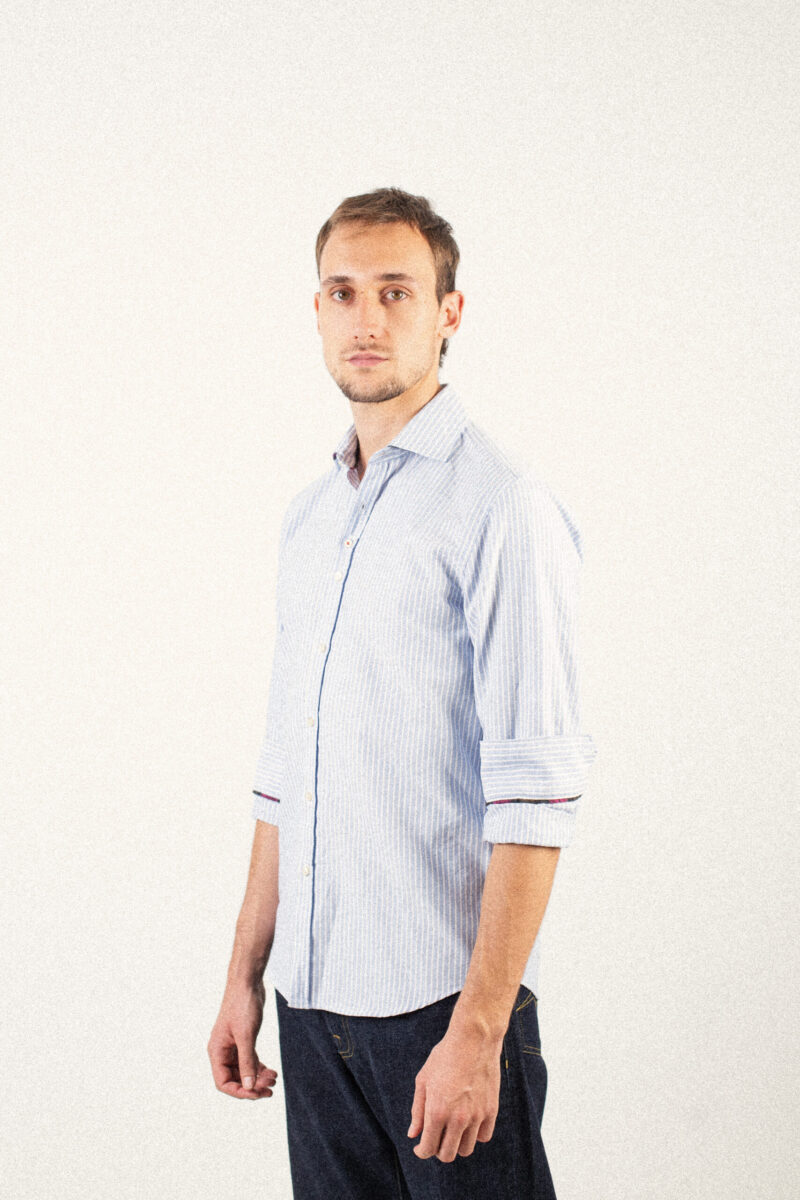 Camisa azul con líneas blancas, confeccionada en 100% algodón de alta calidad, suave y transpirable. Su diseño limpio aporta un estilo clásico y atemporal, con detalles que reflejan la autenticidad y el cuidado artesanal de Bjovuit.