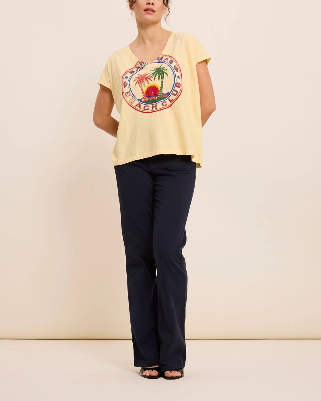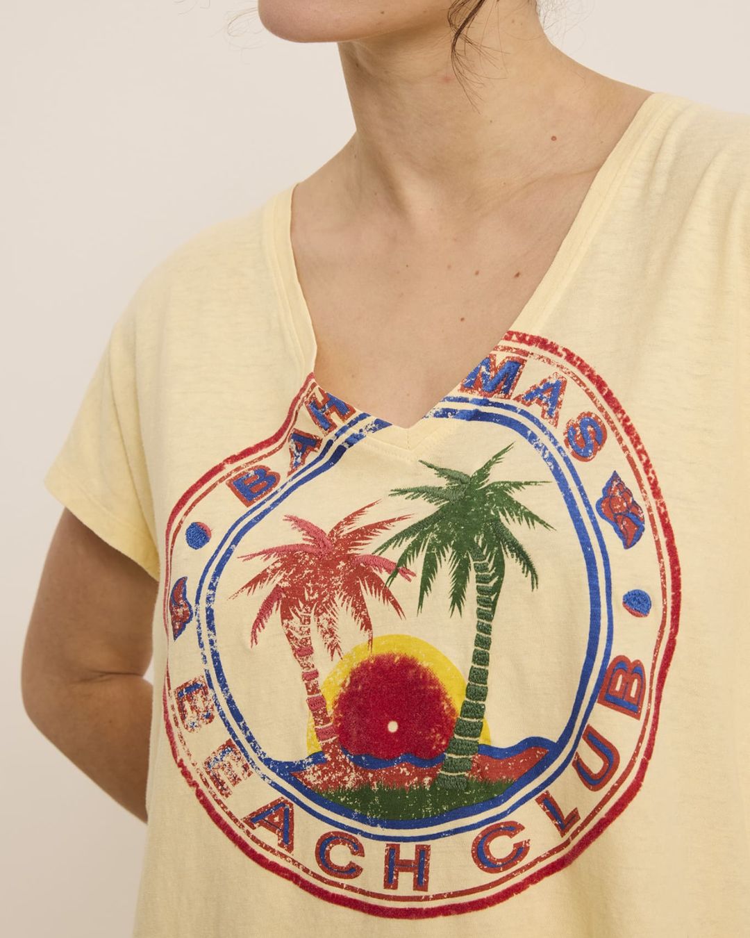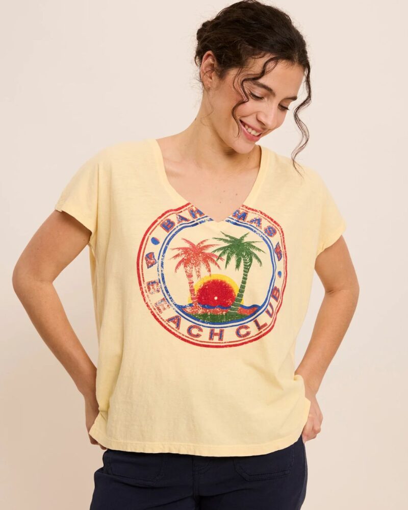 Camiseta amarilla de FIVE para mujer con estampado Bahamas. Diseño de cuello en V y manga corta, ligero y cómodo para el día a día.