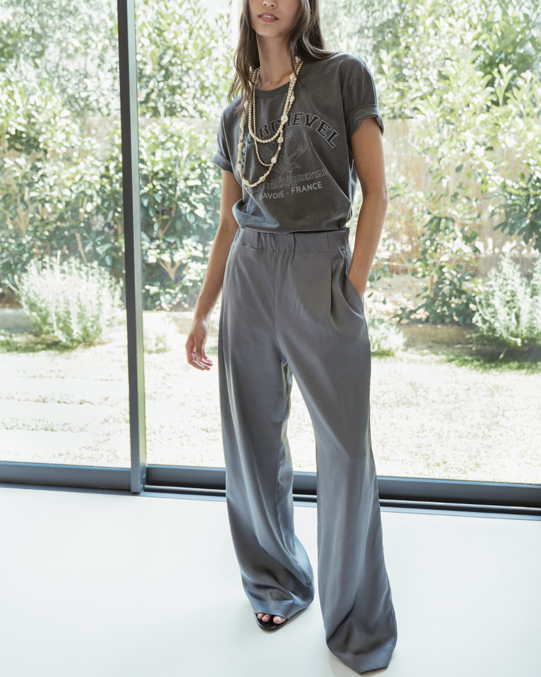 En Llenas 1953 seleccionamos prendas que destacan por su diseño y versatilidad, como el pantalón Giulia Silver de la colección Bad Habits. Su tejido satinado y corte ancho lo convierten en una opción ideal para un look elegante con un aire contemporáneo.
