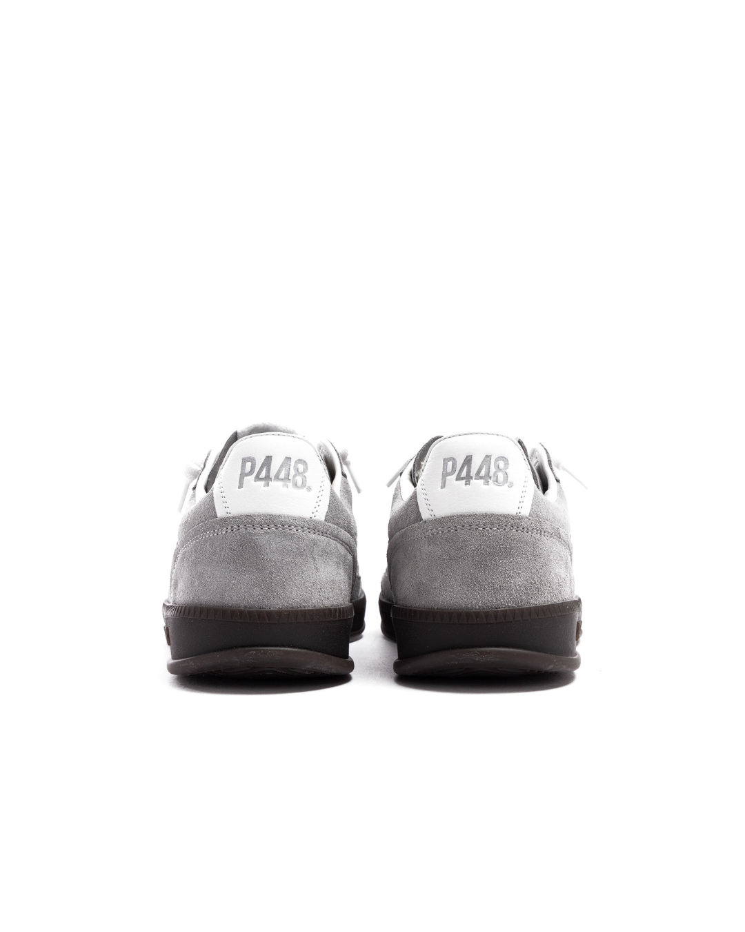 Sneakers P448 John para hombre en un elegante tono gris total, con suela de goma marrón oscuro que aporta contraste y robustez. Incluyen cordones blancos para un look limpio y un par de cordones de recambio en marrón para mayor versatilidad.