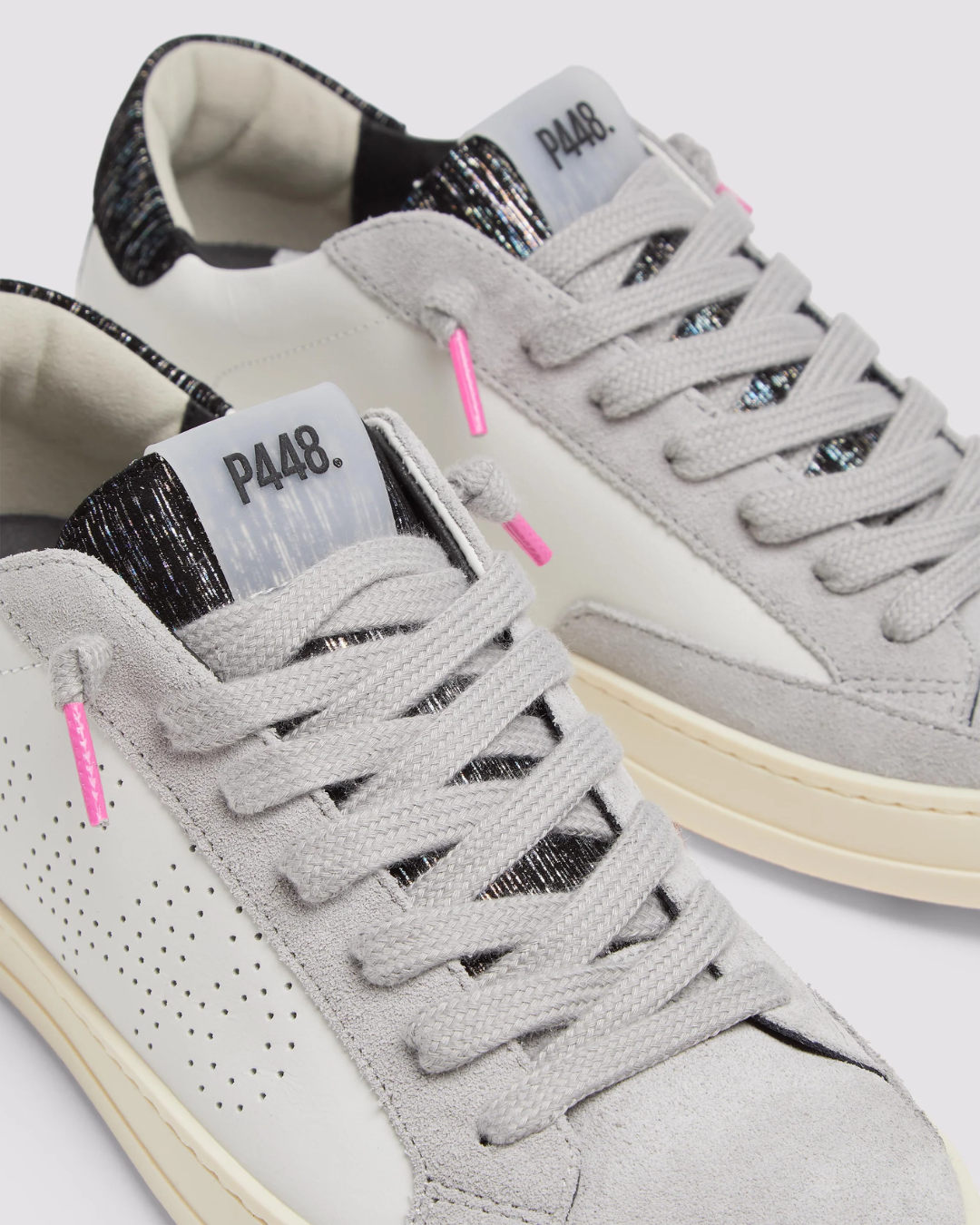 Los cordones grises con punteras fucsia y la suela P448 con base fluorescente rosa completan un diseño atrevido y con personalidad.