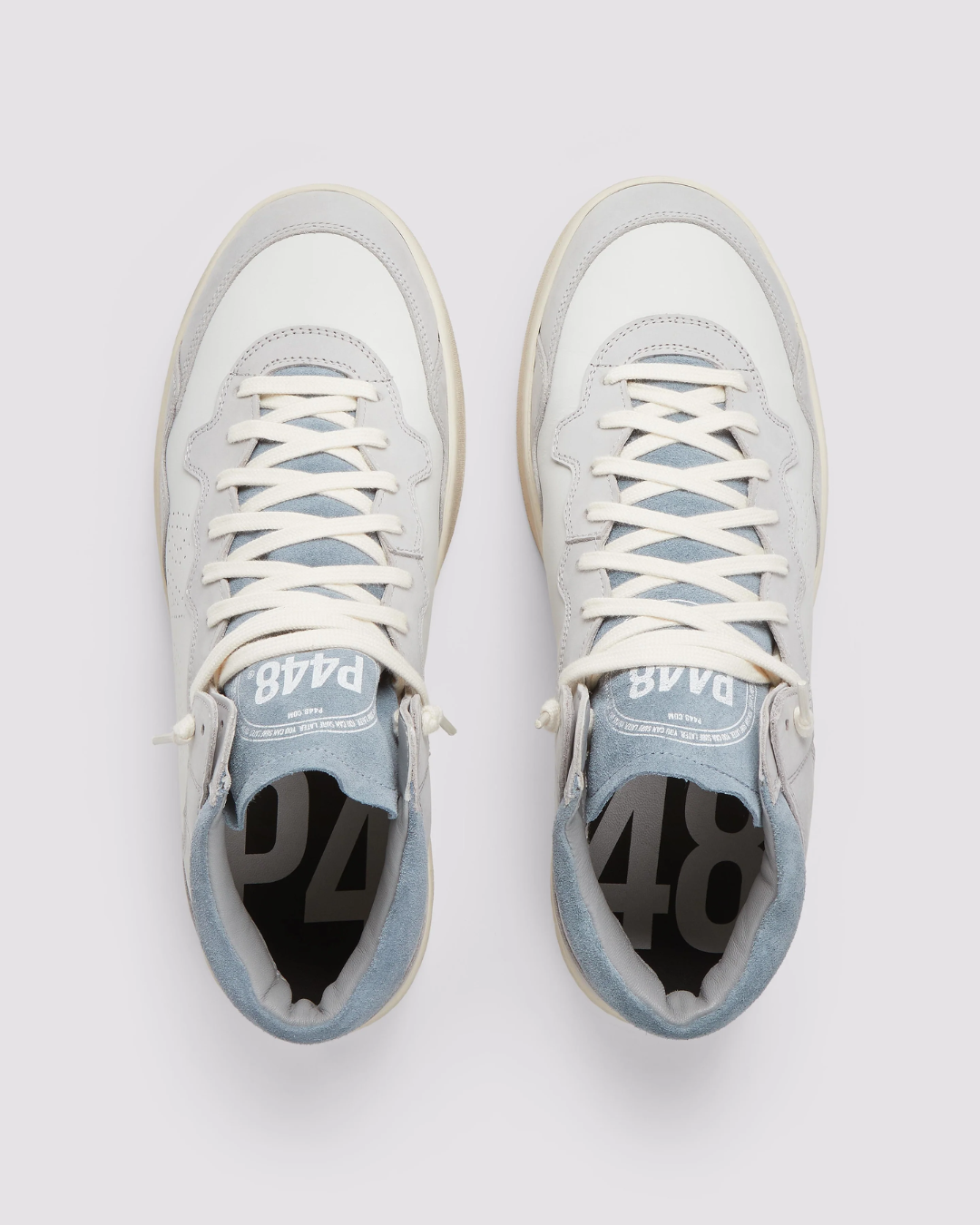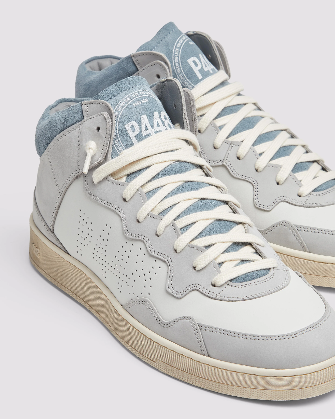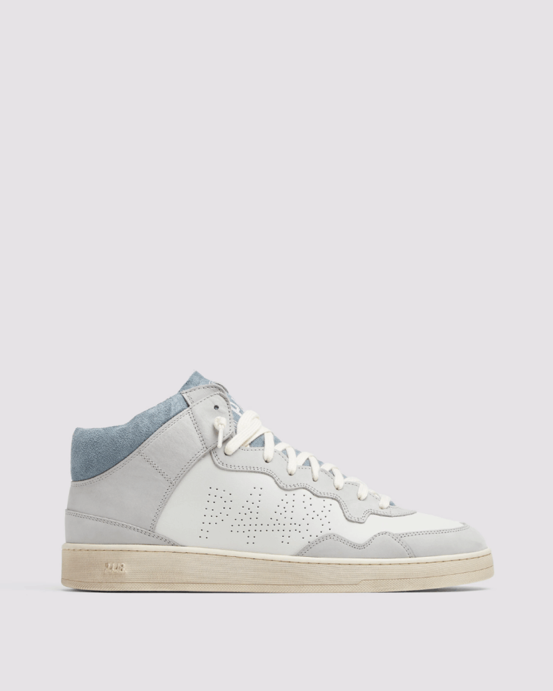 El modelo P448 VERTMID60 combina piel blanca con detalles en nubuck gris y talón en ante azul, creando un diseño moderno y versátil. Una sneaker cómoda y con estilo, perfecta para looks urbanos de la temporada.