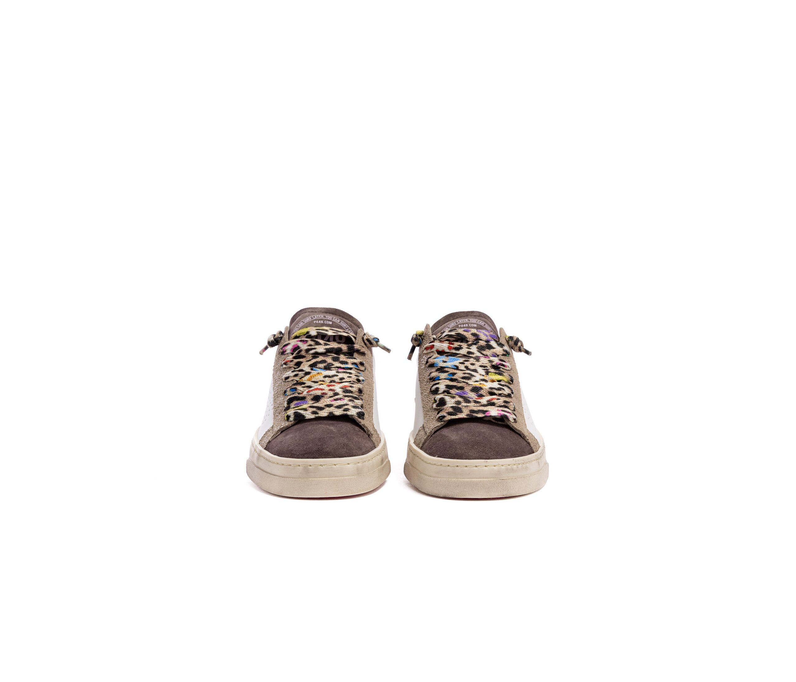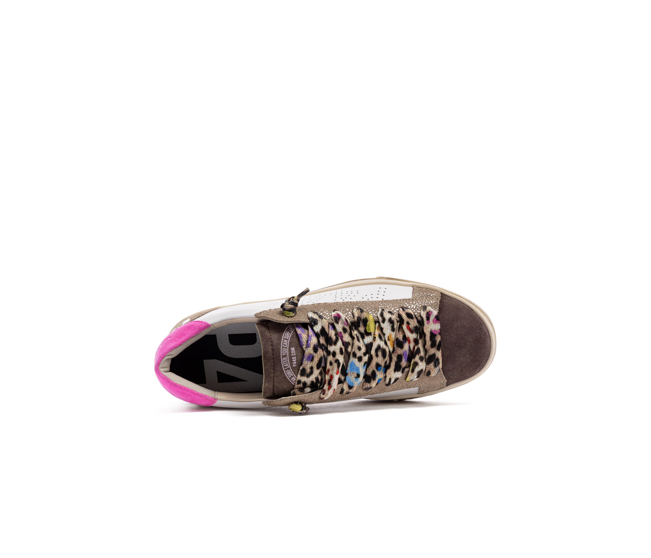 El estampado de leopardo en los cordones aporta un toque único y desenfadado, mientras que la suela rosa añade un aire fresco y femenino. El talón en ante rosa se complementa con detalles en marrón y beige, creando un equilibrio perfecto entre estilo y personalidad.