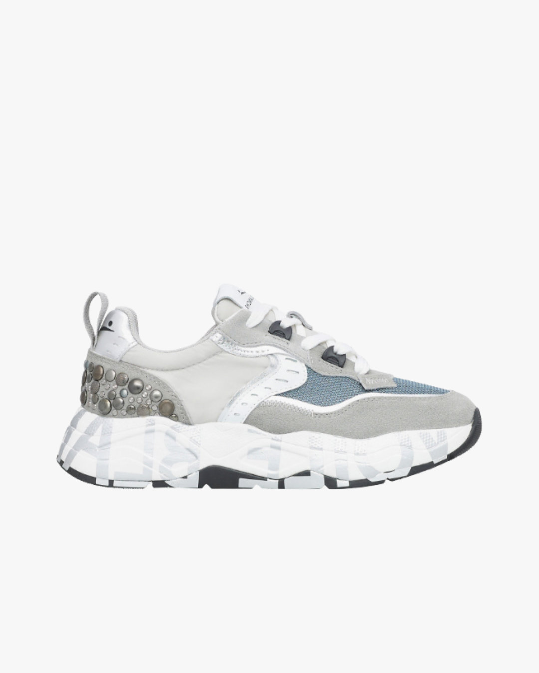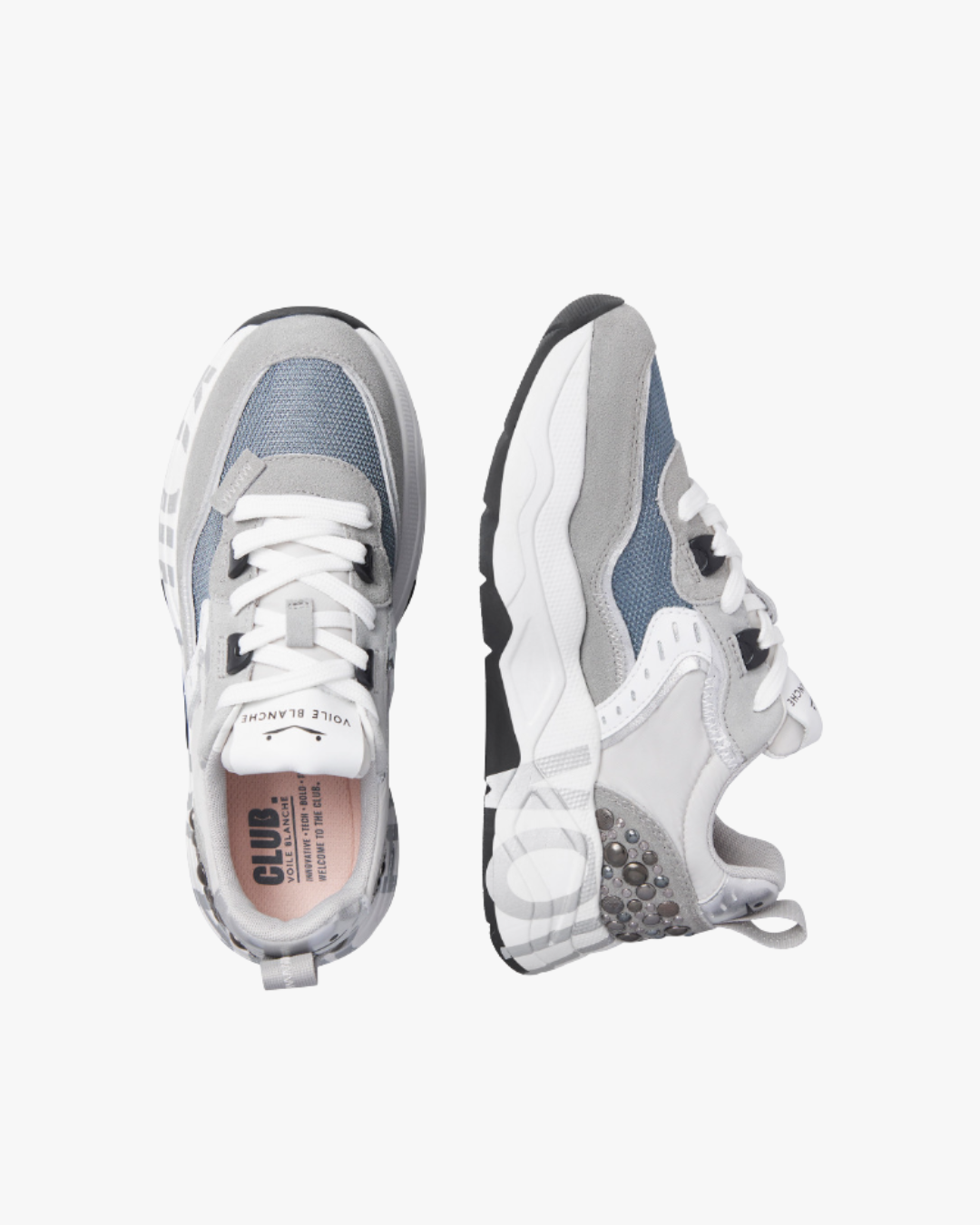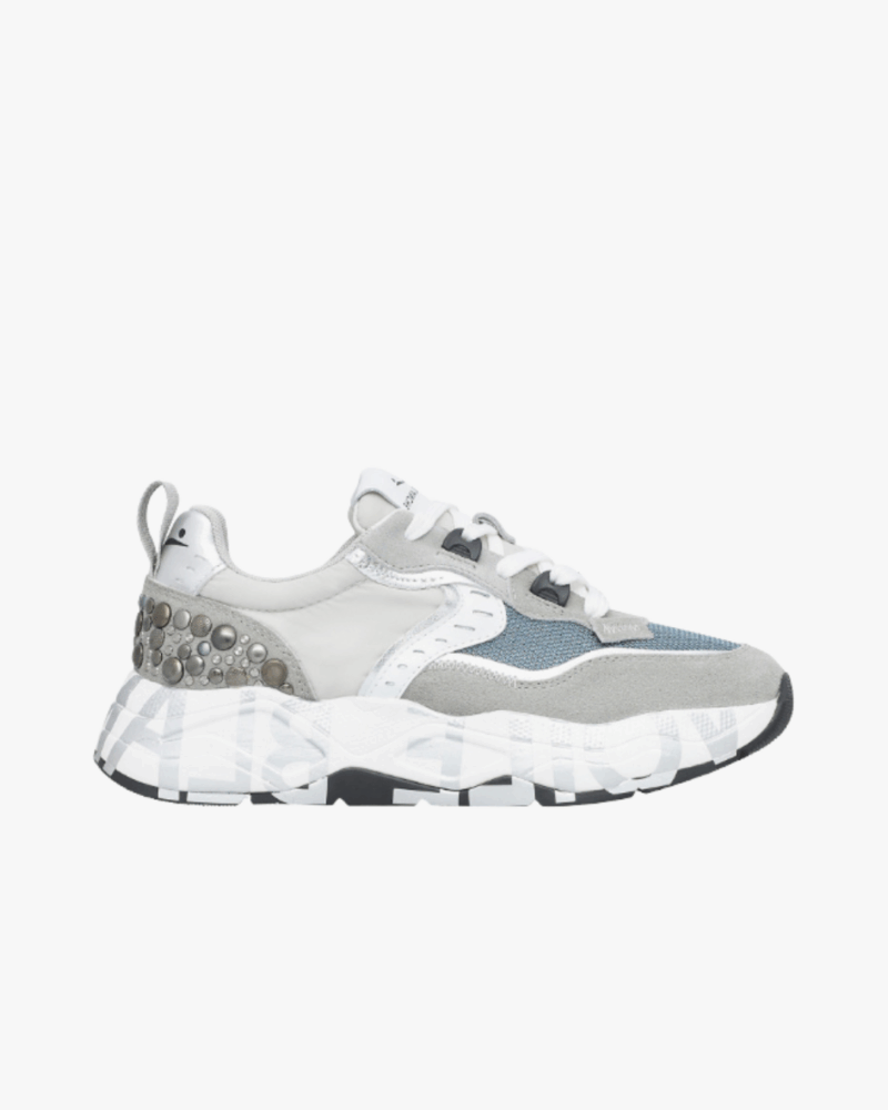 Las Club105 Grey-Silver de Voile Blanche fusionan estilo urbano con un toque rock chic, gracias a las tachuelas planas metálicas en el talón. Su diseño combina ante, piel laminada y tejido técnico, creando un contraste sofisticado y moderno.