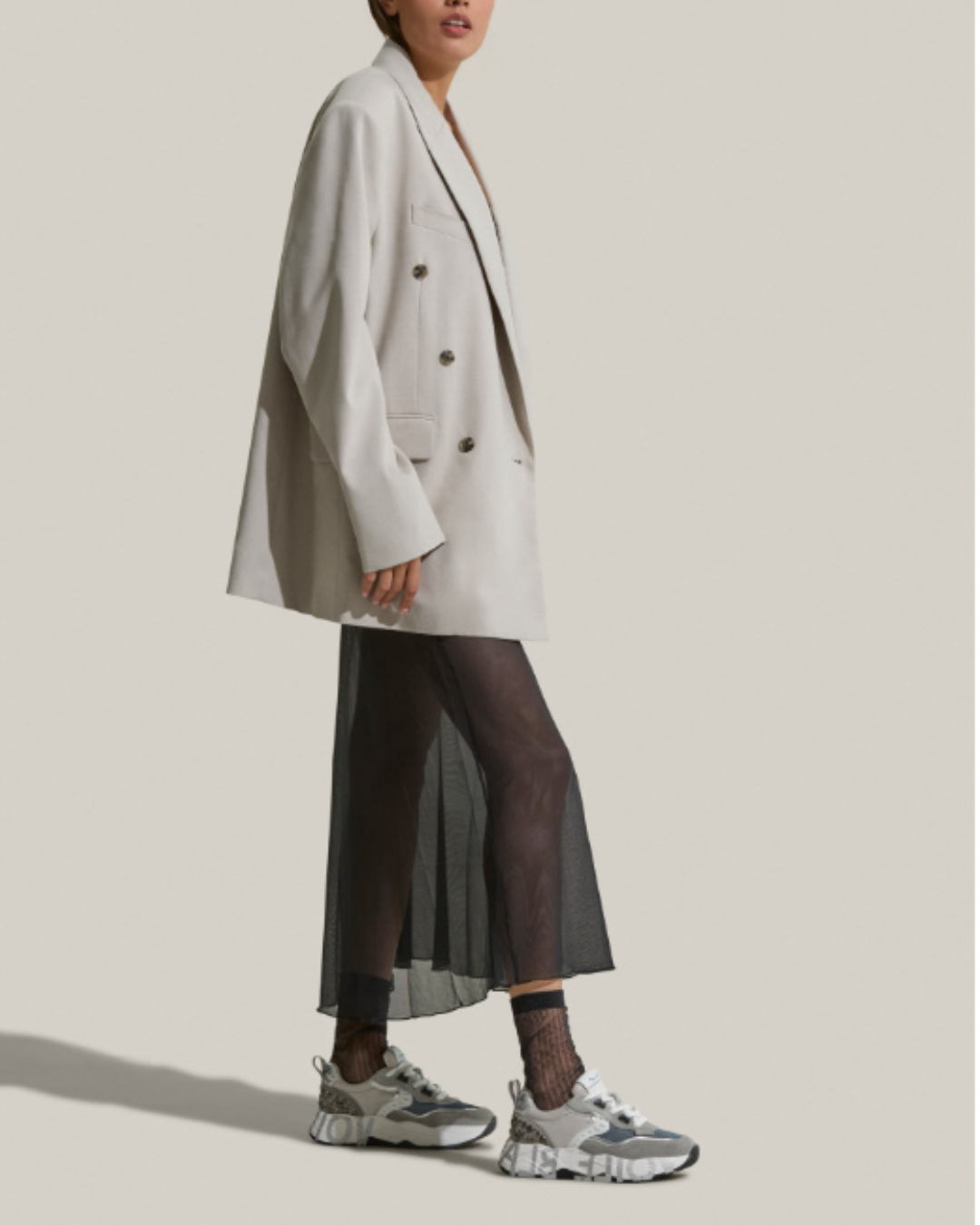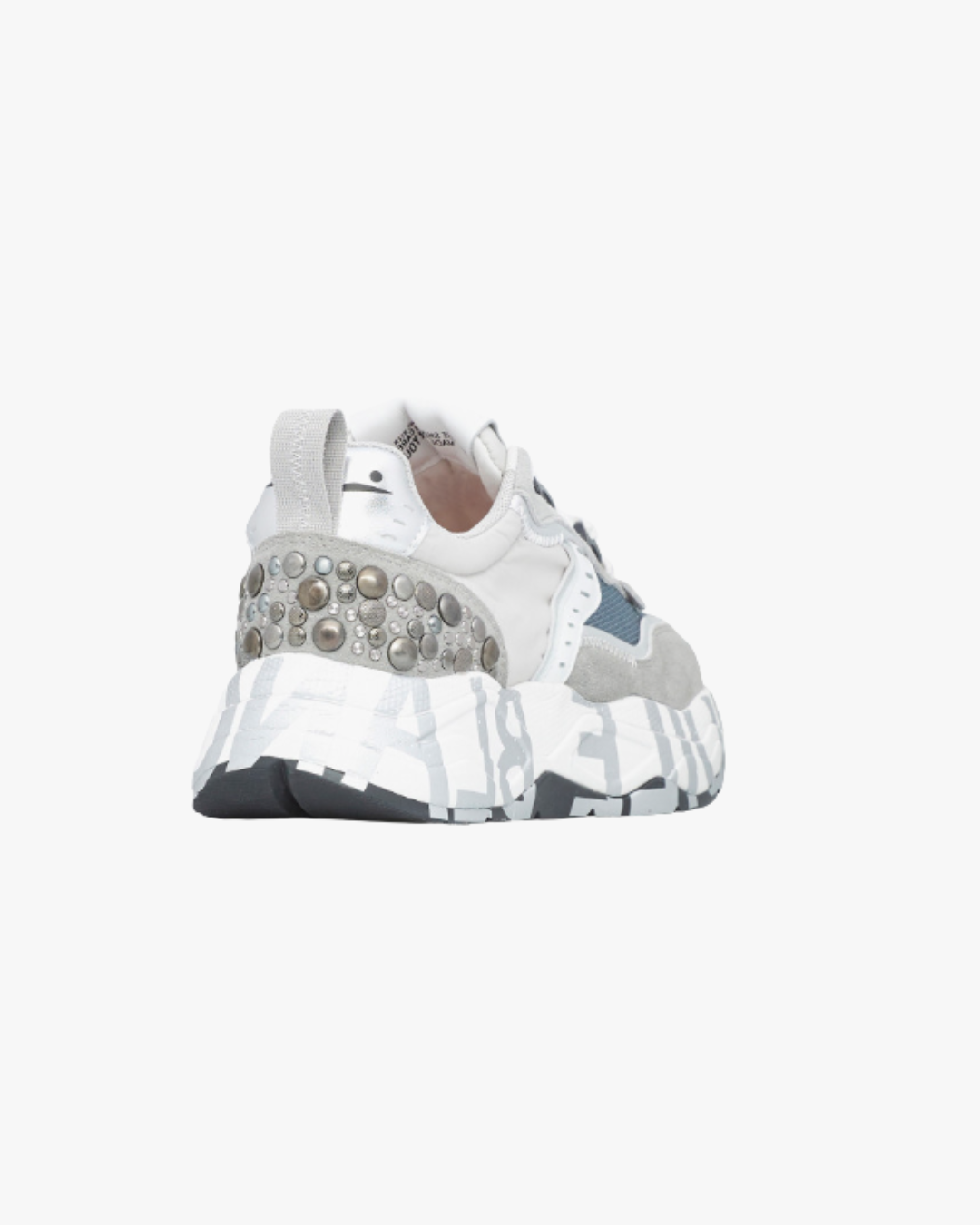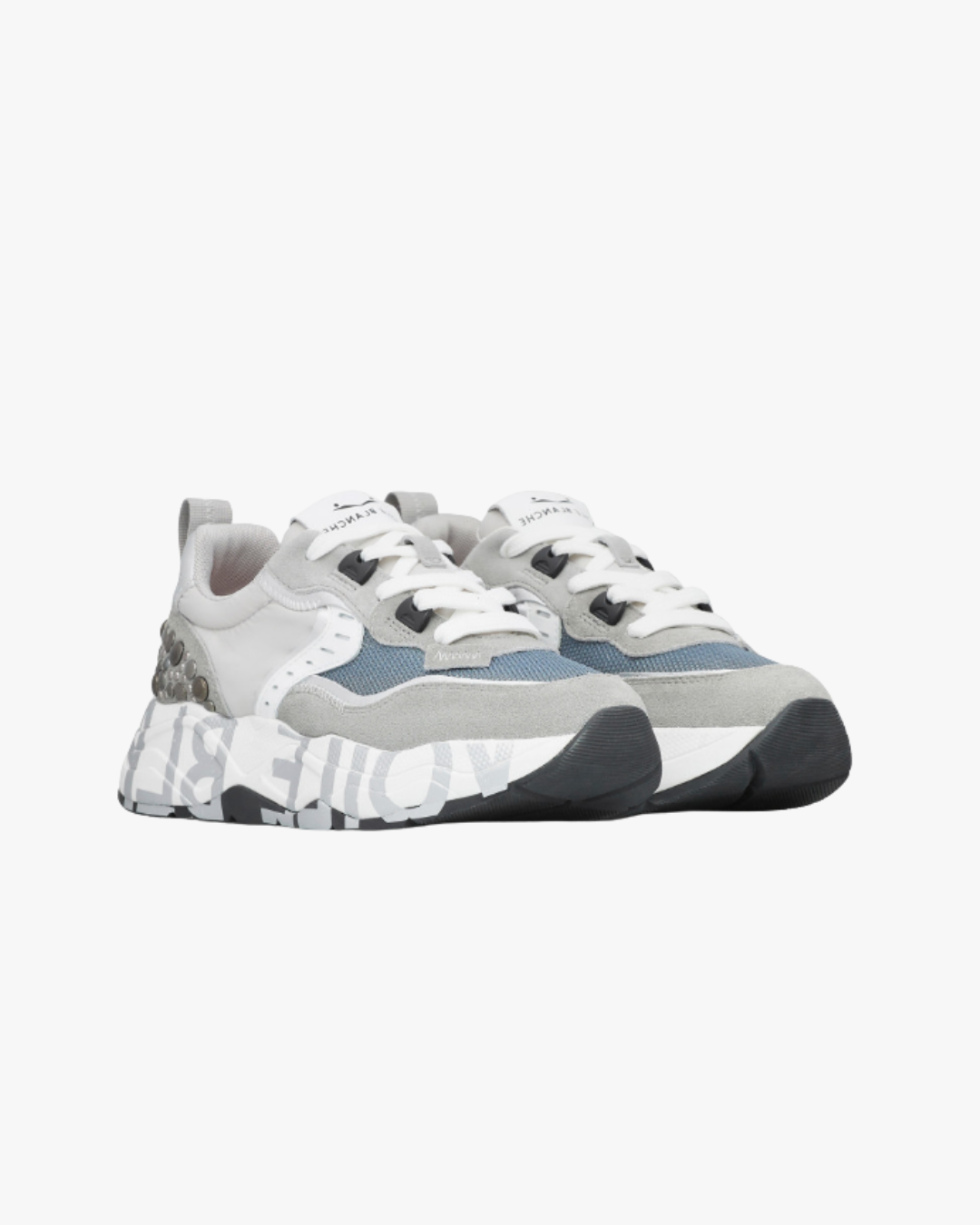 Las Club105 Grey-Silver de Voile Blanche fusionan estilo urbano con un toque rock chic, gracias a las tachuelas planas metálicas en el talón. Su diseño combina ante, piel laminada y tejido técnico, creando un contraste sofisticado y moderno.