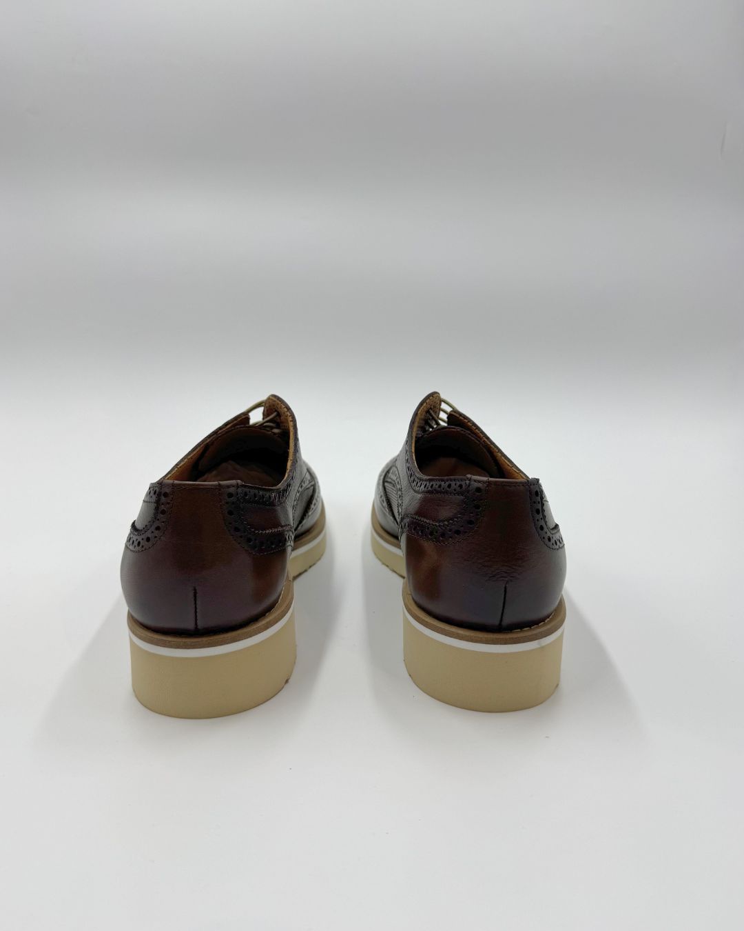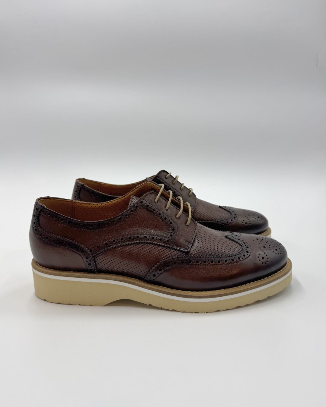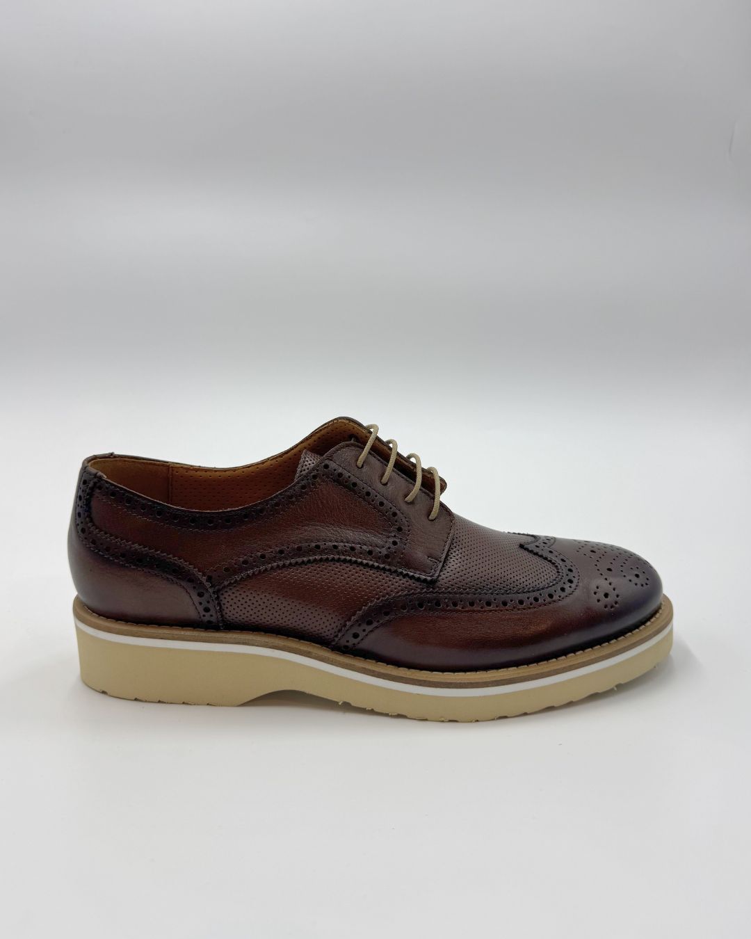 Confeccionado en piel natural en tono marrón, destaca por sus detalles perforados estilo brogue y su acabado ligeramente matizado, que aportan profundidad y personalidad. Su suela clara de goma añade un contraste moderno, además de ligereza y comodidad en cada paso.