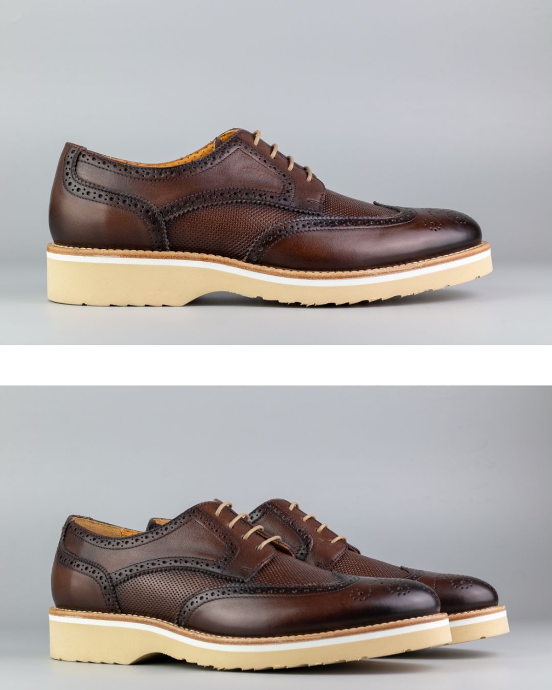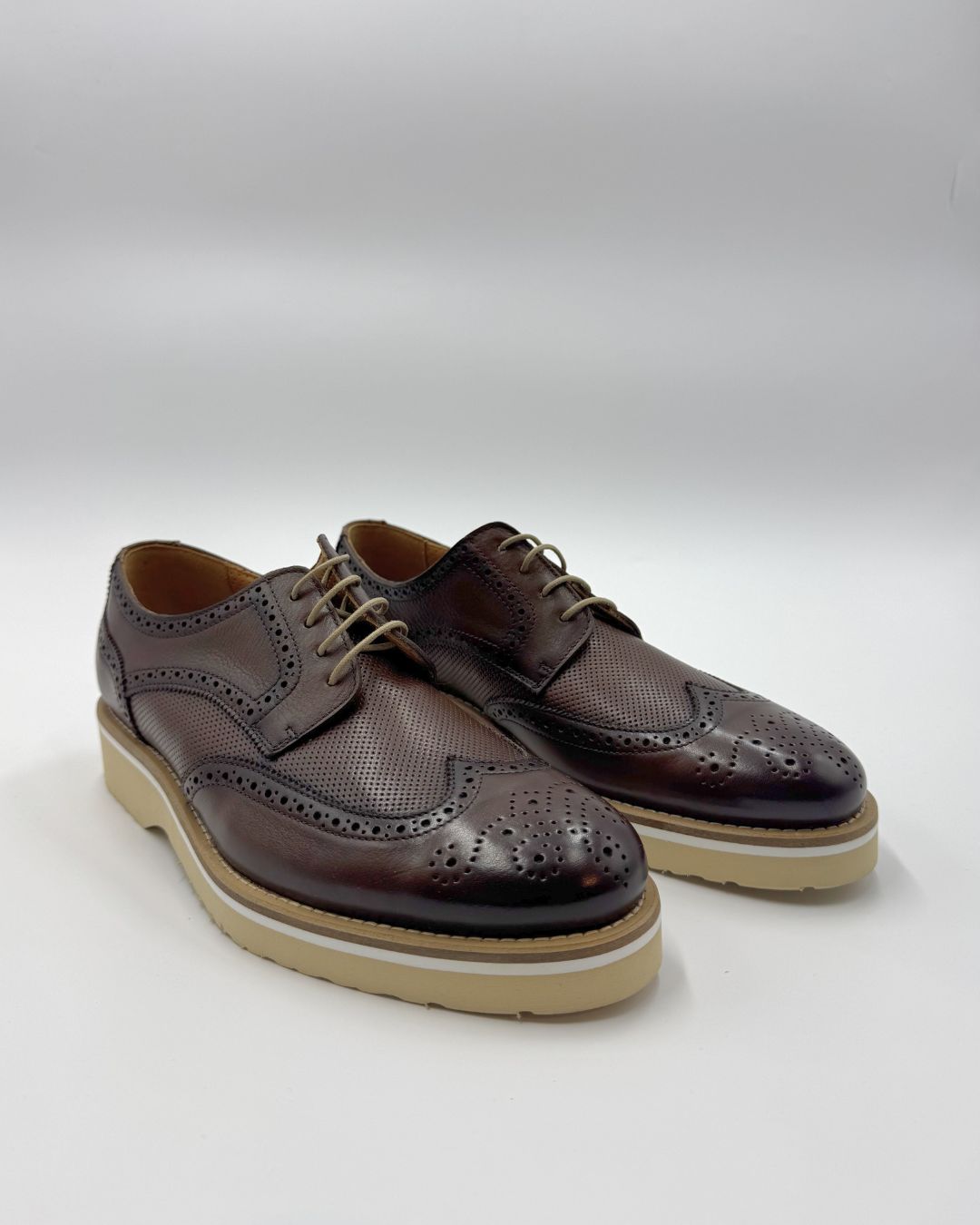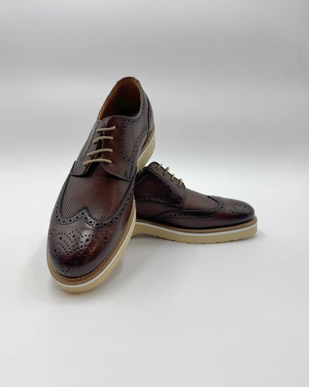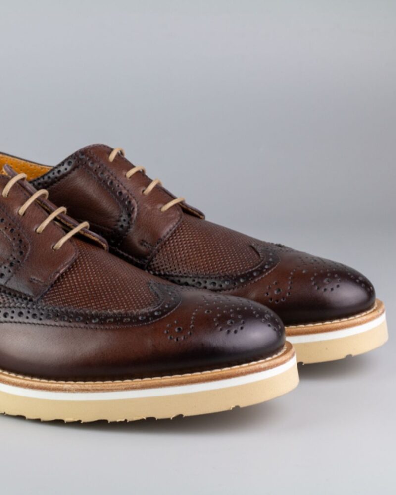 Confeccionado en piel natural en tono marrón, destaca por sus detalles perforados estilo brogue y su acabado ligeramente matizado, que aportan profundidad y personalidad. Su suela clara de goma añade un contraste moderno, además de ligereza y comodidad en cada paso.