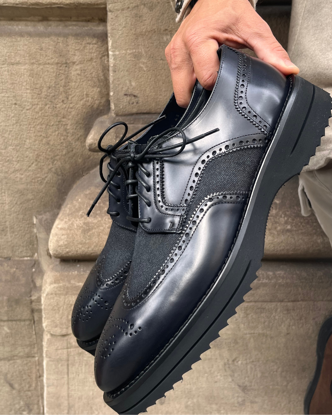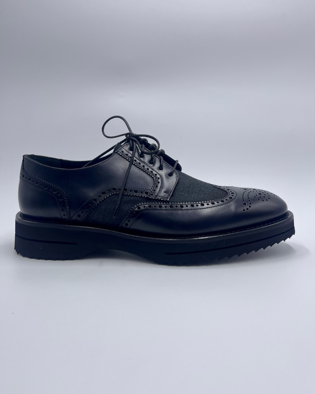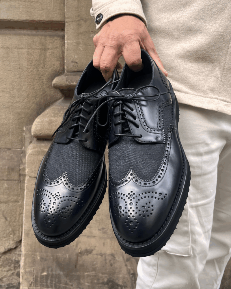 Su diseño tipo brogue con punteado artesanal y cordones del mismo tono refuerza su carácter refinado, mientras que la suela de goma ligera garantiza confort y durabilidad sin perder el estilo formal.